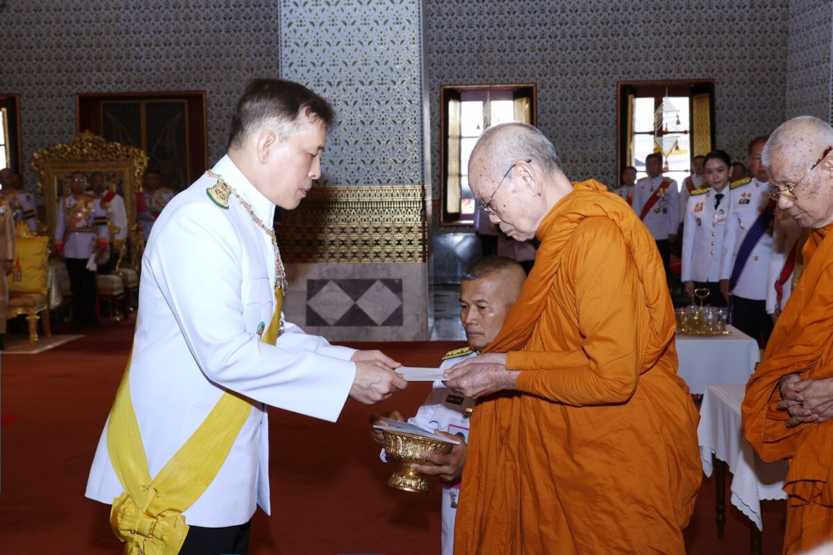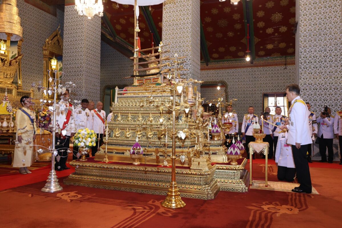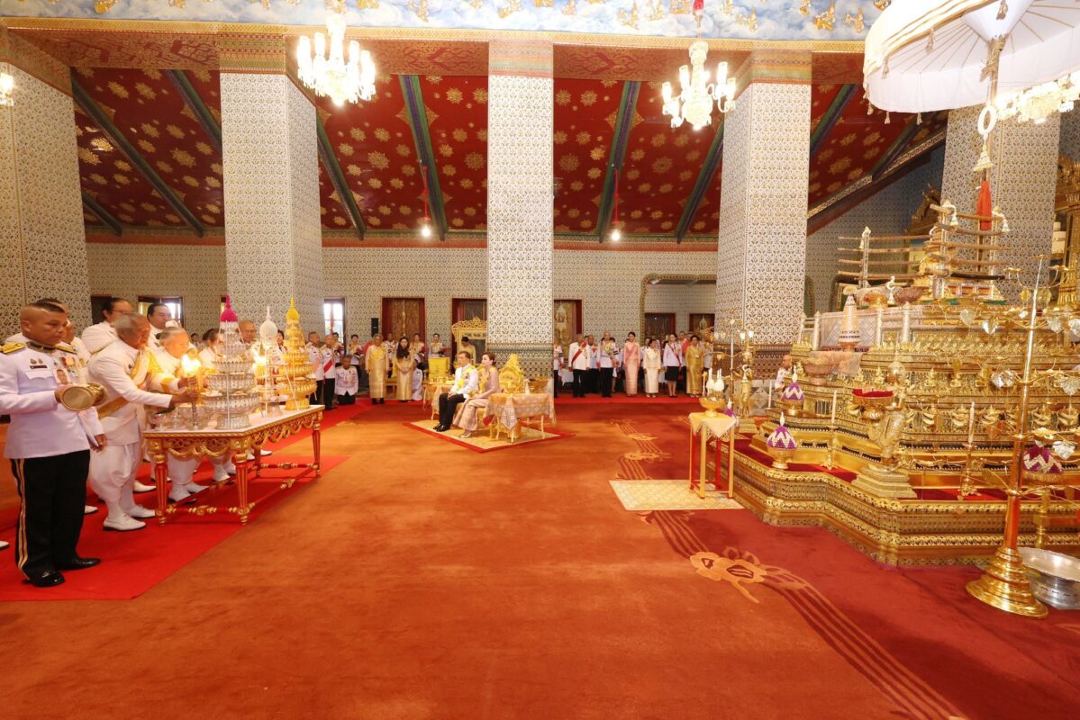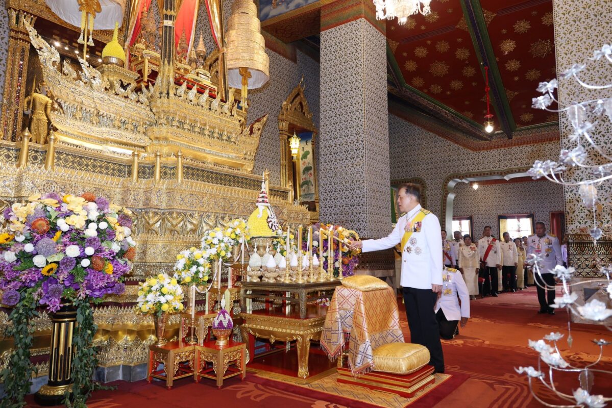 ครั้นเสด็จพระราชดำเนินถึง พระบาทสมเด็จพระเจ้าอยู่หัว ทรงจุดธูปเทียนเครื่องนมัสการพานทองสองชั้นบูชาพระพุทธปฏิมาชัยวัฒน์ รัชกาลที่ ๑ ถึงรัชกาลที่ ๗ และรัชกาลที่ ๙ ที่หน้าพระที่นั่งบุษบกมาลา ทรงกราบ ทรงศีล สมเด็จพระอริยวงศาคตญาณ สมเด็จพระสังฆราช สกลสังฆปริณายก ถวายศีล และพระสงฆ์ถวายพรพระ จบแล้ว เสด็จพระราชดำเนินไปทรงประเคนปิ่นโตภัตตาหารแด่ สมเด็จพระอริยวงศาคตญาณ สมเด็จพระสังฆราช สกลสังฆปริณายก ประธานสงฆ์ นอกนั้น ทรงพระกรุณาโปรดเกล้าโปรดกระหม่อมให้พระราชวงศ์ องคมนตรี และข้าราชการชั้นผู้ใหญ่ ทรงประเคน และประเคน จนครบ ๒๐ รูป เสร็จแล้ว ทรงประเคนจตุปัจจัยไทยธรรมแด่ สมเด็จพระราชาคณะ พระราชาคณะ เจ้าคณะรอง และพระราชาคณะ จนครบ ๒๐ รูป ทรงหลั่งทักษิโณทก พระสงฆ์ถวายอนุโมทนา ถวายอดิเรก ถวายพระพรลา จากนั้น เสด็จพระราชดำเนินไปทรงจุดธูปเทียนเครื่องทองน้อยบูชาเทวดาที่รักษาพระนพปฎลมหาเศวตฉัตร เครื่องราชกกุธภัณฑ์ ทรงคม พราหมณ์เบิกแว่นเวียนเทียนสมโภชพระนพปฎลมหาเศวตฉัตร เครื่องราชกกุธภัณฑ์ ครบ ๓ รอบ พระมหาราชครูพิธีศรีวิสุทธิคุณ ประธานพระครูพราหมณ์ เจิมพระนพปฎลมหาเศวตฉัตร โหรหลวงผูกผ้าสีชมพู เสร็จแล้ว พระบาทสมเด็จพระเจ้าอยู่หัว เสด็จพระราชดำเนินไปทรงพระสุหร่ายเครื่องราชกกุธภัณฑ์ และพระราชลัญจกรพระครุฑพ่าห์ทองคำประจำรัชกาลที่พระแท่นพระนพปฎลมหาเศวตฉัตร แล้วทรงกราบพระพุทธปฏิมาชัยวัฒน์ รัชกาลที่ ๑ ถึงรัชกาลที่ ๗ และรัชกาลที่ ๙ ที่หน้าพระที่นั่งบุษบกมาลา ทรงรับการถวายความเคารพของผู้มาเฝ้าทูลละอองธุลีพระบาท แล้วเสด็จออกจากพระที่นั่งอมรินทรวินิจฉัย ประทับรถยนต์พระที่นั่ง เสด็จพระราชดำเนินกลับ
