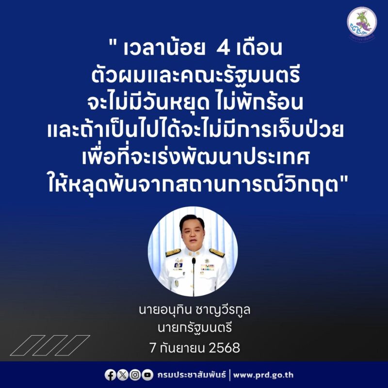 นายกฯ “อนุทิน” ย้ำ 4 เรื่องเร่งด่วน “เศรษฐกิจปากท้อง – ชายแดนไทย – กัมพูชา – ภัยทางธรรมชาติ – ภัยทางสังคม” เผยหลักการทำงานของรัฐบาล ย้ำเรื่องความถูกต้องกฎหมายคลายความกังวลไม่แทรกแซงกระบวนการยุติธรรม และทำงานตอบแทนประชาชนด้วยการทำงานมุ่งประสิทธิภาพและความถูกต้อง