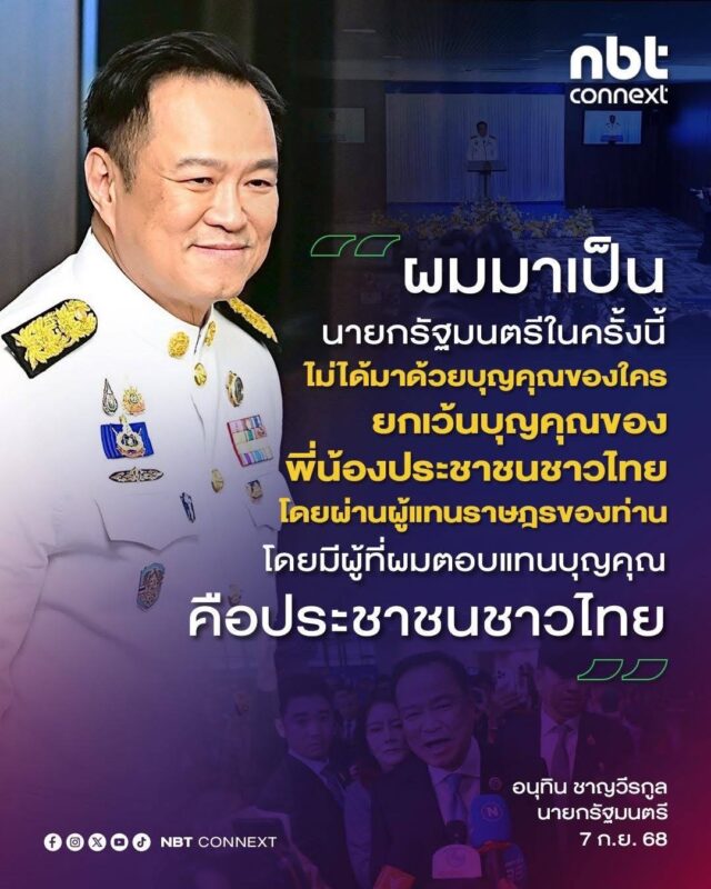 วันที่ 7 กันยายน 2568 นายอนุทิน ชาญวีรกูล นายกรัฐมนตรี แถลงข่าวต่อสื่ิอมวลชน ภายหลังเข้ารับสนองพระบรมราชโองการโปรดเกล้าโปรดกระหม่อม แต่งตั้งให้ดำรงตำแหน่ง นายกรัฐมนตรีคนที่ 32 ของประเทศไทย ณ ที่ทำการพรรคภูมิใจไทย
