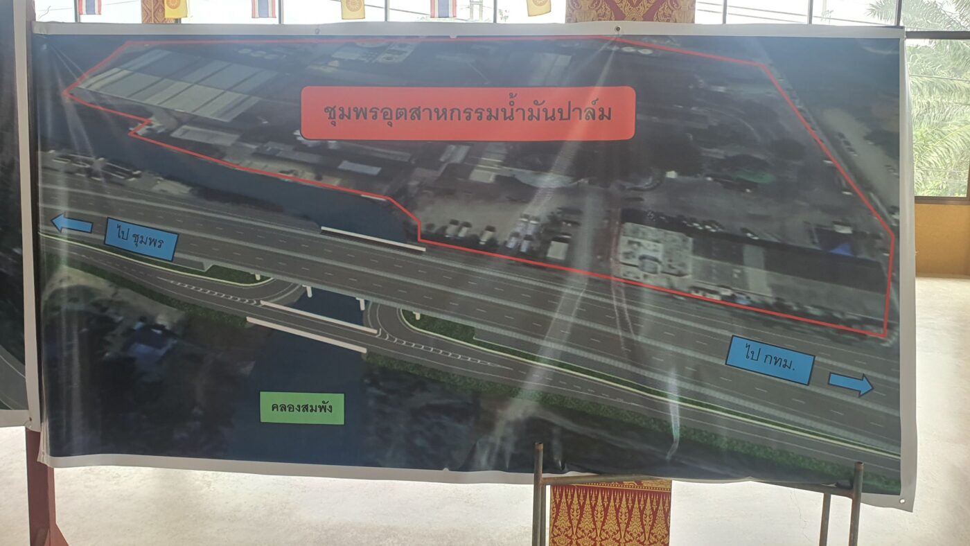 วันที่ 18 กันยายน 2568 เวลา 10.00 น. นายชุมพล ไทยนุกูล ผอ.โรงงาน บมจ.ชุมพรอุตสาหกรรมน้ำมันปาล์ม พร้อมด้วยกลุ่มแรงงานของโรงงาน และชาวบ้านในละแวก กว่า 200 คน รวมตัวพร้อมถือป้าย ระบุใจความว่า “ขอคัดค้านการก่อสร้างสะพานสูงและที่กลับรถใต้สะพาน บริเวณคลองสมพัง( กม.440-865)” โดยยืนปักหลักอยู่หน้าศาลากลางเปรียญ ภายในวัดพ่อตาหินช้าง หมู่ที่ 17 ต.ท่าแซะ อ.ท่าแซะ จ.ชุมพร ซึ่งเป็นสถานที่แขวงทางหลวงชุมพร โดยกรมหลวง ได้จัดเวทีประชาคมและแสดงความคิดเห็น ครั้งที่ 2 ช่วงคลองพัง ( กม.440-865) ของการก่อสร้างทางหลวงหมายเลข 4 สายกรุงเทพฯ-จุดผ่านแดนถาวรสะเดา ตอน บ.พ่อตาหินช้าง-บ.วังครก จำนวน 5 ช่วง ด้วยงบประมาณ 9 ร้อยล้านบาท