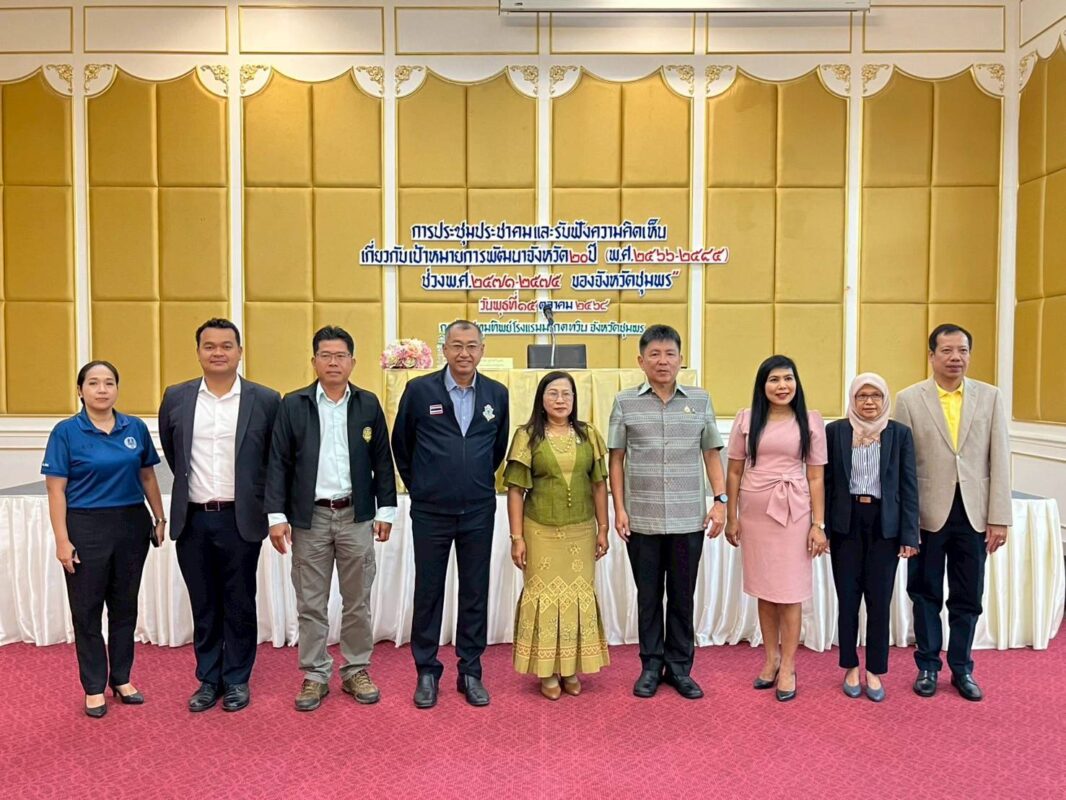 วันที่ 15 ตุลาคม 2568 นายเธียรชัย ชูกิตติวิบูลย์ ผู้ว่าราชการจังหวัดชุมพร เป็นประธานเปิดการประชุมประชาคมรับฟังความคิดเห็นเกี่ยวกับเป้าหมายการพัฒนาจังหวัด 20 ปี (พ.ศ. 2566 – 2585) ช่วง พ.ศ. 2571 – 2575 ของจังหวัดชุมพร เพื่อให้เป็นไปตามหลักเกณฑ์การจัดทำเป้าหมายการพัฒนาจังหวัด 20 ปี โดยมีผู้แทนส่วนราชการ ส่วนกลาง ส่วนภูมิภาค หน่วยงาน รัฐวิสาหกิจ อำเภอ องค์กรปกครองส่วนท้องถิ่น ภาคเอกชน ภาคประชาสังคม รวมจำนวนทั้งสิ้น 200 คน เข้าร่วมพิธีเปิดฯ ณ ห้องปทุมทิพย์ โรงแรมมรกต ทวิน อำเภอเมืองชุมพร จังหวัดชุมพรดำเนินงานโดย นางสาวปานนภา สุภาพรเหมินทร์ หัวหน้าสำนักงานจังหวัดชุมพร