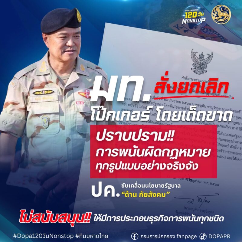 เพื่อให้การดำเนินงานของกระทรวงมหาดไทยสอดคล้องกับนโยบายสำคัญดังกล่าว รัฐมนตรีว่าการกระทรวงมหาดไทยจึงอาศัยอำนาจตามมาตรา 17 แห่งพระราชบัญญัติการพนัน พุทธศักราช 2478 ยกเลิกคำสั่งกระทรวงมหาดไทยที่ 2253/2568 ลงวันที่ 30 กรกฎาคม 2568 ให้งดการอนุญาตให้มีการเล่นการพนันโป๊กเกอร์ หรือไพ่เผ โดยเด็ดขาด
