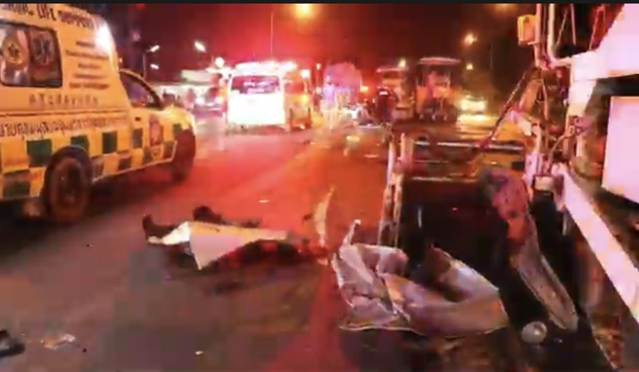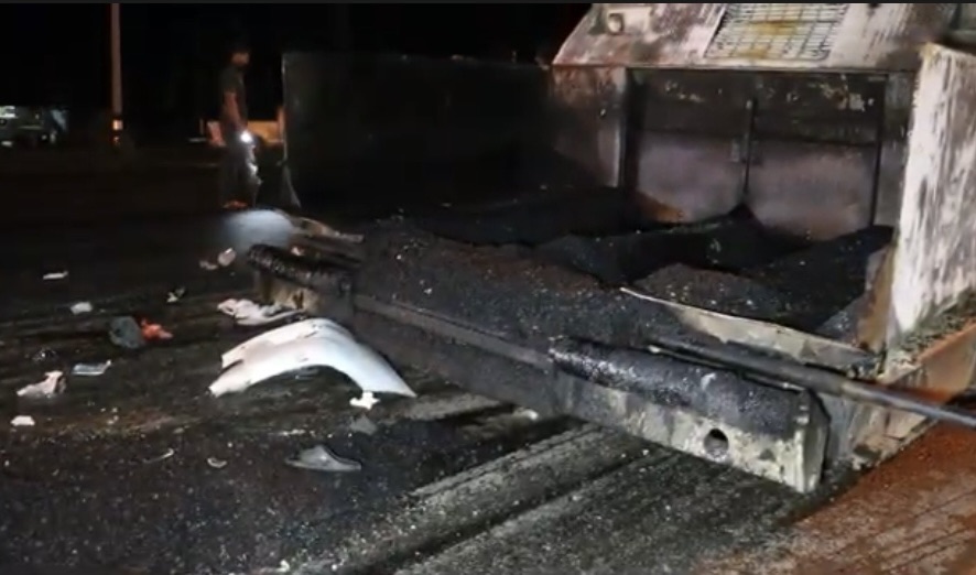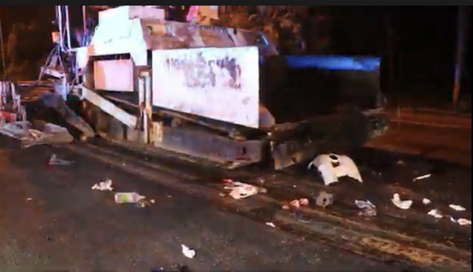 ตรวจสอบบริเวณจุดเกิดเหตุมีรถบรรทุกยางมะตอย จำนวน 1 คัน รถบดถนน 2 คัน และรถปูลาดยางมะตอย 1 คัน มีเศษชิ้นส่วนรถยนต์คู่กรณีติดอยู่กับรถปูยางมะตอย พร้อมทั้งมีเศษชิ้นส่วนรถตก และอุปกรณ์ที่ใช้ทำถนนไม่ว่าจะเป็นพลั่ว รถไสเศษหินดิน เสื้อสะท้อนแสง กระติกน้ำ รองเท้าคนเจ็บ ทั้งหมดวางกระจัดกระจายเกลื่อนถนน ซึ่งเป็นภาพที่น่าสลดใจ