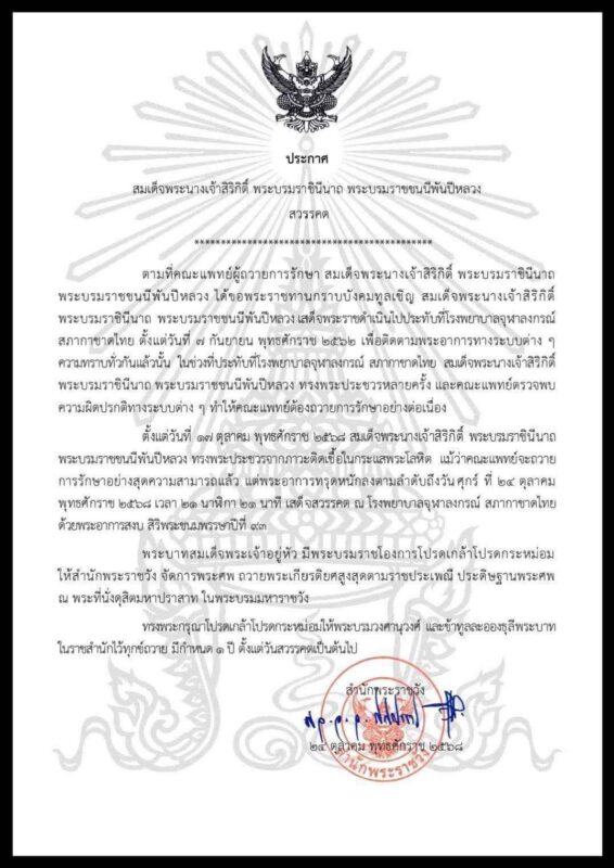 ประกาศ สมเด็จพระนางเจ้าสิริกิติ์ พระบรมราชินีนาถ พระบรมราชชนนีพันปีหลวง เสด็จสวรรคต