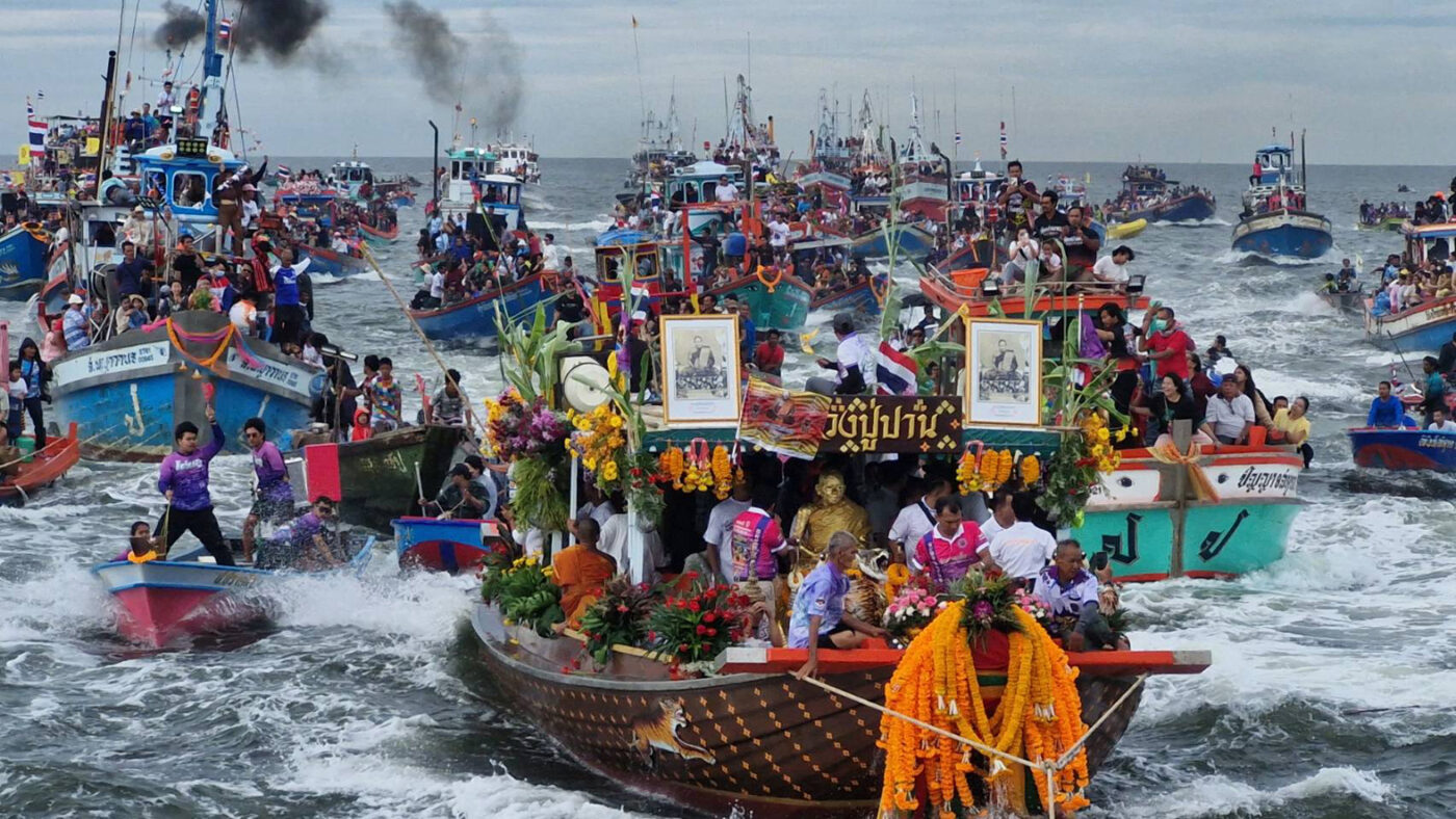 ชาวบ้านและผู้ที่เดินทางมาร่วมงานได้อัญเชิญรูปหล่อหลวงพ่อปาน จากวัดมงคลโคธาวาส ลงเรือบุษบกแห่ไปตามลำคลองคลองด่านออกไปทางปากอ่าว โดยมีเรือประมงของชาวบ้านจำนวนมาก เข้าร่วมขบวนแห่ออกไปที่ปากอ่าว หลังจากนั้นได้แล่นเรือวนรอบปากอ่าว 3 รอบ ก่อนที่จะมีการแจกธงหลวงพ่อปานกลางทะเล ให้แก่เรือประมง และเรือผู้ที่เดินทางไปร่วมงานที่บริเวณกลางทะเล หลังจากนั้นก็จะเคลื่อนขบวนกลับเข้าฝั่ง