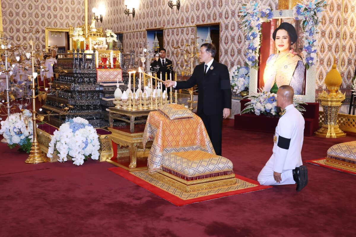 เมื่อเสด็จพระราชดำเนินถึงพระที่นั่งดุสิตมหาปราสาท พระบาทสมเด็จพระเจ้าอยู่หัว เสด็จพระราชดำเนินไปยังที่ประดิษฐานพระบรมศพ ทรงจุดธูปเทียนเครื่องทองน้อย ทรงกราบ แล้วเสด็จพระราชดำเนินไปทรงจุดธูปเทียนเครื่องนมัสการพานทองสองชั้นบูชาพระพุทธรูปประจำพระชนมวาร ที่หน้าพระแท่นพระนพปฎลมหาเศวตฉัตร ทรงกราบ ต่อจากนั้น เสด็จพระราชดำเนินไปยังมุขหน้าพระที่นั่งดุสิตมหาปราสาท ทรงจุดธูปเทียนเครื่องบูชากระบะมุกที่หน้าพระแท่นเตียงพระพิธีธรรมสวดพระอภิธรรม ด้านตะวันออก และด้านตะวันตก ทรงคม แล้วประทับพระราชอาสน์