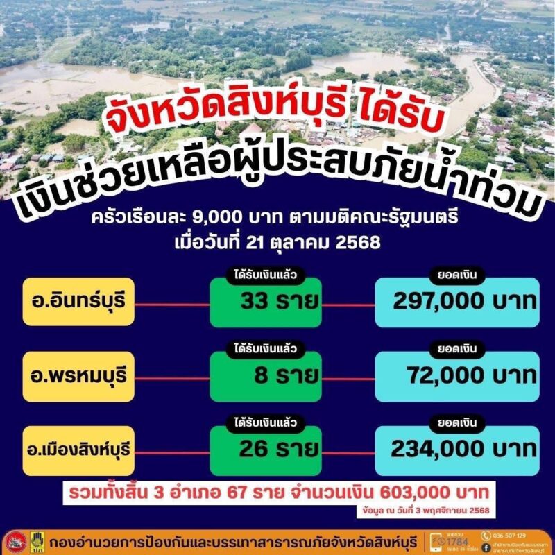 สำหรับจังหวัดสิงห์บุรี ได้เริ่มโอนเงินช่วยเหลือครั้งที่ 1 ในวันนี้ (3 พฤศจิกายน 2568) ให้แก่ผู้ประสบภัยรวมทั้งสิ้น 67 ครัวเรือน เป็นเงินจำนวน 603,000 บาท แยกเป็น