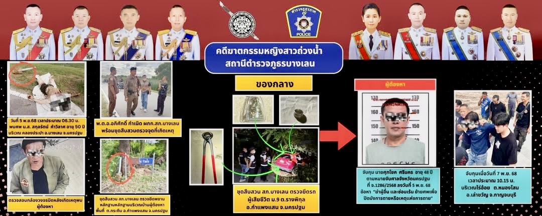 วันที่ 7 พฤศจิกายน 2568 เวลา 15.30 น. ณ บริเวณลานหน้าอาคารตำรวจภูธรภาค 7 ต.พระปฐมเจดีย์ อ.เมือง จ.นครปฐม ตามนโยบายของรัฐบาลด้านการแก้ไขปัญหาอาชญากรรม ภายใต้การอำนวยการของ พล.ต.ท.พิสิฐ ตันประเสริฐ ผบช.ภ. 7 พร้อมด้วย ตำรวจภูธรจังหวัดนครปฐม, สว.สส.สภ.บางเลน เจ้าหน้าที่ตำรวจศูนย์พิสูจน์หลักฐาน 7 และหน่วยปฏิบัติการพิเศษตำรวจภูธรจังหวัดนครปฐม ร่วมกันแถลงผลการจับกุมคดีฆ่ารัดคอหญิงถ่วงน้ำคลองชลประทาน พื้นที่ สภ.บางเลน