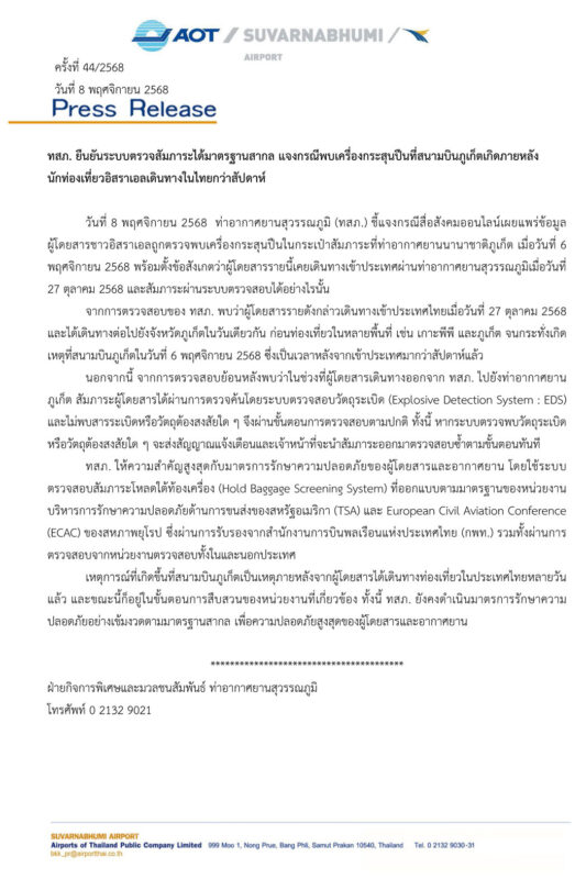 วันที่ 8 พฤศจิกายน 2568 ท่าอากาศยานสุวรรณภูมิ (ทสภ.) ชี้แจงกรณีสื่อสังคมออนไลน์เผยแพร่ข้อมูลผู้โดยสารชาวอิสราเอลถูกตรวจพบเครื่องกระสุนปืนในกระเป๋าสัมภาระที่ท่าอากาศยานนานาชาติภูเก็ต เมื่อวันที่ 6 พฤศจิกายน 2568 พร้อมตั้งข้อสังเกตว่าผู้โดยสารรายนี้เคยเดินทางเข้าประเทศผ่านท่าอากาศยานสุวรรณภูมิเมื่อวันที่ 27 ตุลาคม 2568 และสัมภาระผ่านระบบตรวจสอบได้อย่างไรนั้น