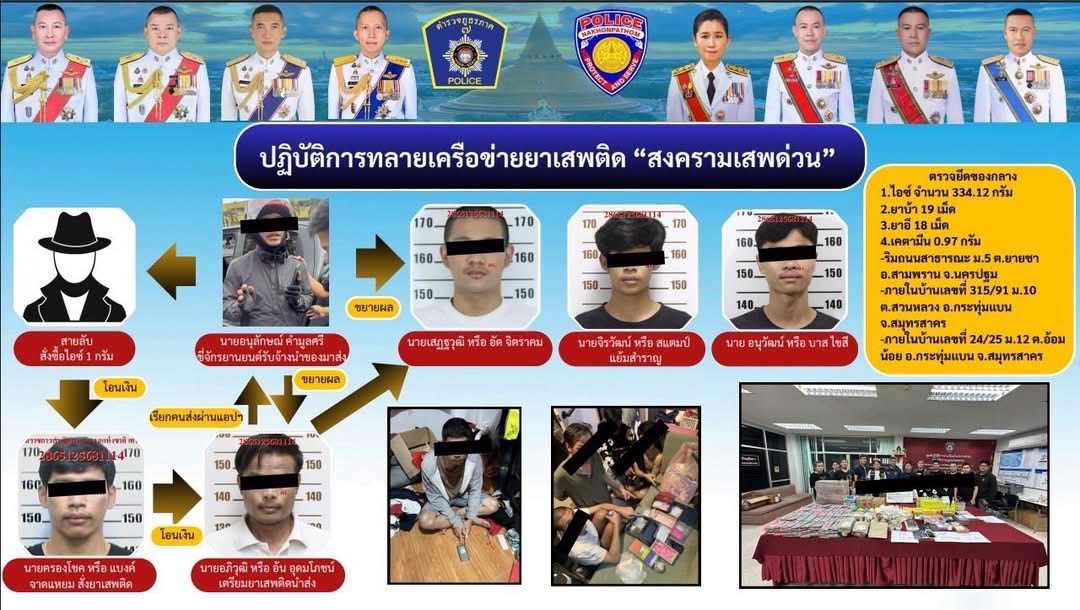 วันที่ 14 พฤศจิกาน 2568 เวลา 13.30 น. ตามนโยบายของรัฐบาลด้านการแก้ไขปัญหายาเสพติด ภายใต้การอำนวยการของ พล.ต.ท.พิสิฐ ตันประเสริฐ ผบช.ภ. 7, พล.ต.ต.ชมชวิณ ปุระธนานนท์, พล.ต.ต.ปิติ นฤขัตรพิชัย รอง ผบช.ภ.7 จังหวัดนครปฐมและตำรวจภูธรจังหวัดนครปฐม ภายใต้การอำนวยการของ นางสาวอโรชา นันทมนตรี ผู้ว่าราชการจังหวัดนครปฐม พล.ต.ต.พิทักษ์ อุปพงษ์ ผบก.ภ.จว.นครปฐม พร้อมด้วย พร้อมเจ้าหน้าที่ตำรวจสืบสวน สภ.สามพราน ร่วมกันแถลงผลการจับกุมผู้ต้องหาคดียาเสพติดรายสำคัญ ในปฏิบัติการทลายเครือข่ายยาเสพติด “สงครามเสพด่วน” จำนวน 1 ราย