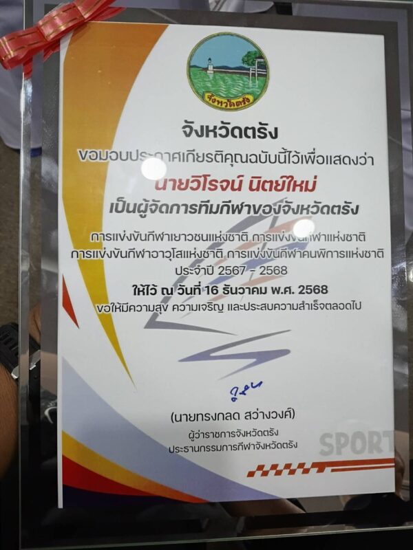 วันกีฬาแห่งชาติ 16 ธันวาคม 2568 วิโรจน์ นิตย์ใหม่ ผู้นำเยาวชนกีฬาโครงการคนละลูกจังหวัดตรัง(ซ้ายมือ) เข้ารับรางวัล เป็นผู้จัดการทีมกีฬาของจังหวัดตรัง โครงการคนละลูกขอแสดงความยินดีมาณ.โอกาสนี้ด้วย