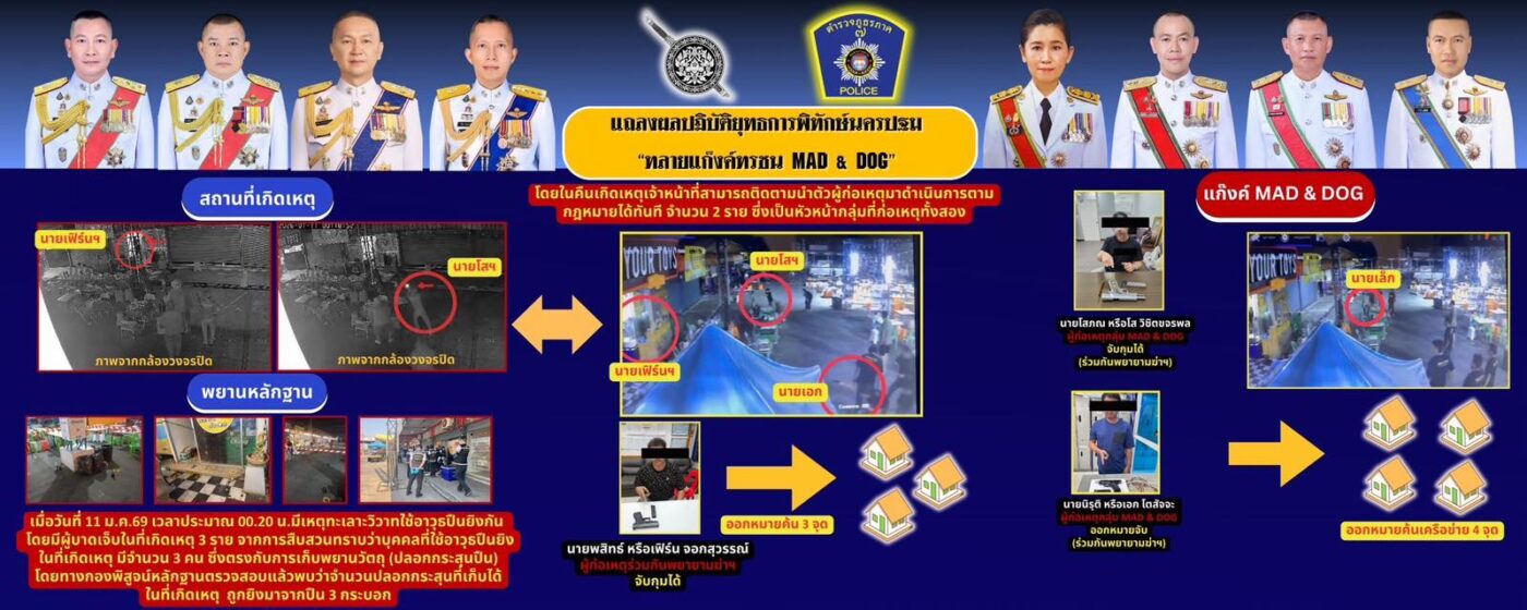 และจากการสืบสวนสอบสวนของเจ้าหน้าที่ตำรวจ พบว่าตอนเกิดเหตุ นายพสิทธิ์ จอกสุวรรณ ใช้อาวุธปืนยิงใส่ นายโสภณ วิชิตขจรพล และนายโสภณฯ ได้ใช้อาวุธปืนยิงโต้ตอบใส่นายพสิทธิ์ฯ โดยก่อนเกิดเหตุ นายโสภณฯ พร้อมพวกในกลุ่ม “แมดแอนด์ด๊อก” ได้เดินเท้าเข้ามาบริเวณหน้าร้าน YourToys (ร้านของนายพสิทธิ์ฯ) โดยกลุ่มนายโสภณฯ ได้ปาขวดเบียร์ใส่นายพสิทธิ์ฯ เป็นเหตุให้นายพสิทธิ์ฯ ใช้อาวุธปืนยิงใส่กลุ่มดังกล่าว และเกิดการยิงโต้ตอบกันระหว่างทั้งสองฝ่าย เหตุการณ์ดังกล่าวมีผู้ได้รับบาดเจ็บรวม 3 ราย แบ่งเป็นฝ่ายนายโสภณฯ จำนวน 2 ราย และฝ่ายนายพสิทธิ์ฯ จำนวน 1 ราย ต่อมา เจ้าหน้าที่ตำรวจได้รวบรวมพยานหลักฐานและออกหมายจับผู้ก่อเหตุเพิ่มเติม คือ นายนิรุติ โตสัจจะ ซึ่งเป็นผู้ใช้อาวุธปืนยิงใส่นายพสิทธิ์ฯ และสามารถติดตามจับกุมตัวพร้อมของกลางอาวุธปืนได้ นำส่งพนักงานสอบสวนดำเนินคดีตามกฎหมาย ทั้งนี้อยู่ระหว่างการสืบสวนรวบรวมพยานหลักฐานเพื่อออกหมายจับผู้ร่วมก่อเหตุเพิ่มเติมต่อไป
