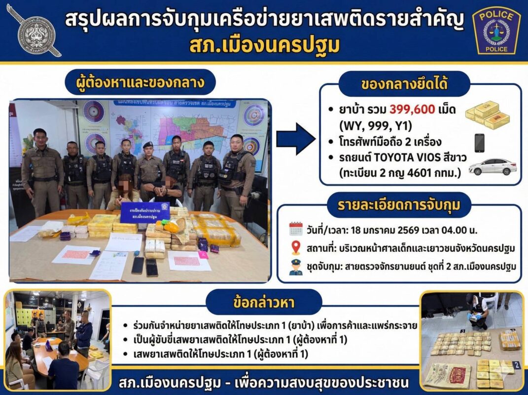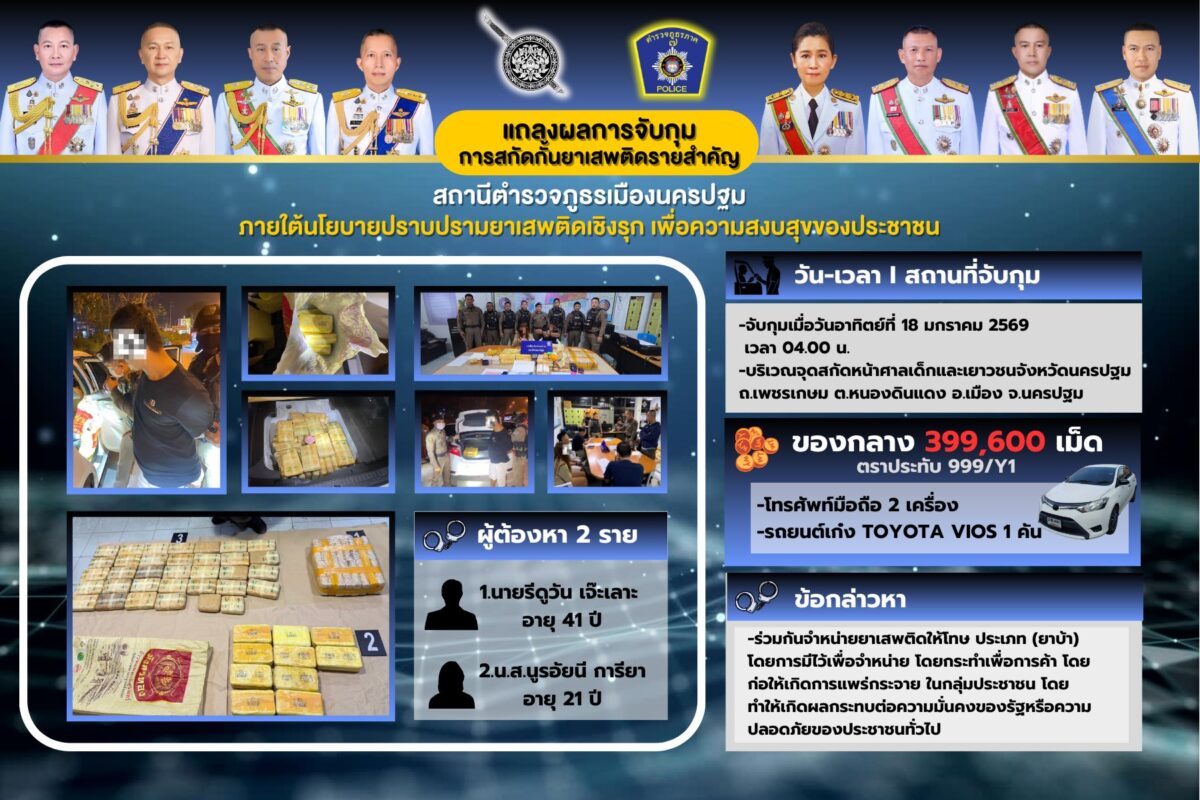 วันที่ 19 มกราคม 2569 เวลา 10.30 น. ที่กองบัญชาการตำรวจภูธรภาค 7 พล.ต.ต.พิทักษ์ อุปพงษ์ ผบก.ภ.จว.นครปฐม พ.ต.อ.พงษ์สวัสดิ์ คำปาเชื้อ รอง ผบก.ภ.จว.นครปฐม พ.ต.อ.กฤษณัฐ วงษ์กล้าหาญ รอง ผบก.ภ.จว.นครปฐม พ.ต.อ.อชิรวัตติ์ ถาวรเจริญวัฒน์ ผกก.สภ.เมืองนครปฐม พ.ต.ท.ตะวัน วัฒนรังสรรค์ รอง ผกก.ป.สภ.เมืองนครปฐม พ.ต.ท.ฤทธิชัยปกรณ์ ดำรงค์อิทธิสกุล รอง ผกก.สส.สภ.เมืองนครปฐม ร่วมกันแถลงผลการจับกุมคดียาเสพติด ผู้ต้องหา คือ นายรีดูวัน เจ๊ะเลาะ (ผู้ต้องหาที่ 1) อายุ 41 ปี และ นางสาวนูรอัยนี การียา อายุ 20 ปี โดยแจ้งข้อกล่าวหาผู้ต้องหาทั้งสอง ร่วมกันจำหน่ายยาเสพติดให้โทษ ประเภท 1 (ยาบ้า) โดยการมีไว้เพื่อจำหน่าย โดยกระทำเพื่อการค้า โดยก่อให้เกิดการแพร่กระจาย ในกลุ่มประชาชน โดยทำให้เกิดผลกระทบต่อความมั่นคงของรัฐหรือความปลอดภัยของประชาชนทั่วไป ส่วนผู้ต้องหาที่ 1 ตั้งข้อหาเพิ่มเติม เป็นผู้ขับขี่เสพยาเสพติดให้โทษประเภทที่ 1 (เมทแอมเฟตามีน) โดยผิดกฎหมาย และเสพ พร้อมของกลางในคดี ได้แก่ 1.ยาเสพติดให้โทษประเภทที่ 1 (ยาบ้า) ทั้งหมด จำนวน 399,600 เม็ด โทรศัพท์มือถือ จำนวน 2 เครื่อง และ รถยนต์เก๋งโตโยต้า วีออส สีขาว หมายเลขทะเบียน 2 กญ 4601 กรุงเทพมหานคร ซึ่งจับกุมได้ที่บริเวณหน้าศาลเด็กและเยาวชนจังหวัดนครปฐม ถนนเพชรเกษม ต.หนองดินแดง อ.เมืองนครปฐม เมื่อวันที่ 18 มกราคม 2569 เวลา 04.00 น.