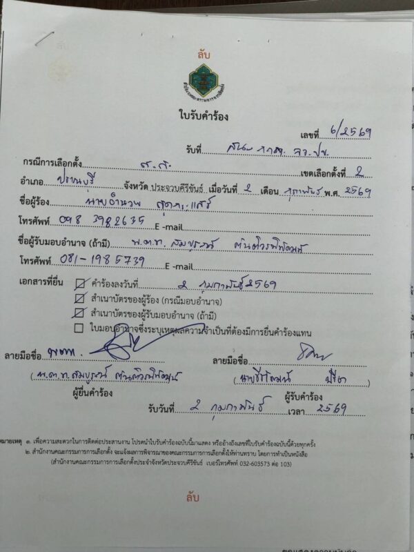 วันที่ 9 กุมภาพันธ์ 2569 ผู้สื่อข่าวรายงานเพิ่มเติมว่า ภายหลังการปิดหีบลงคะแนนเลือกตั้งในหลายพื้นที่ของจังหวัดประจวบคีรีขันธ์ ยังคงต้องรอผลคะแนนอย่างเป็นทางการจาก กกต.จังหวัด อีกครั้ง ขณะเดียวกัน ยังคงมีผู้สมัครจากพรรคภูมิใจไทยยื่นเรื่องร้องเรียนต่อ กกต.จังหวัดประจวบคีรีขันธ์อย่างต่อเนื่อง เพื่อขอให้ดำเนินการตรวจสอบและเอาผิดผู้สมัคร ส.ส.รายหนึ่ง หลังพบพฤติกรรมที่อาจเข้าข่ายกระทำผิดกฎหมายเลือกตั้ง โดยกรณีดังกล่าว สืบเนื่องจากการยื่นหนังสือร้องเรียนต่อ กกต.จังหวัดประจวบคีรีขันธ์ ระบุว่า มีนายกองค์การบริหารส่วนตำบลวังก์พง ซึ่งเป็นข้าราชการทางการเมือง เข้าไปมีส่วนร่วมช่วยผู้สมัคร ส.ส.รายหนึ่งในการหาเสียง โดยมีการนำป้ายหาเสียงไปติดตั้งตามจุดต่าง ๆ ในพื้นที่ อำเภอปราณบุรี ซึ่งอาจเข้าข่ายเป็นการช่วยเหลือผู้สมัครโดยมิชอบตามกฎหมายเลือกตั้งหรือไม่นั้น