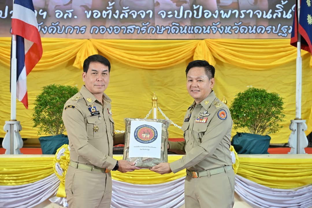 โอกาสนี้ นายอรรถวุฒิ พึ่งเนียม รองผู้บังคับการกองอาสารักษาดินแดนจังหวัดนครปฐม ได้มอบสิ่งของเพื่อเป็นขวัญกำลังใจ และมอบทุนการศึกษามูลนิธิอาสารักษาดินแดนในพระบรมราชินูปถัมภ์ มอบทุนการศึกษาของสมาคมแม่บ้านมหาดไทย ในส่วนของกองบังคับการกองอาสารักษาดินแดนจังหวัดนครปฐม ได้เริ่มมีสมาชิกกองอาสารักษาดินแดน ประจำการในจังหวัดนครปฐม มาตั้งแต่ปี พ.ศ. 2534 รวมเป็นเวลา 51 ปี มีกำลังพลรวมทั้งสิ้น 108 นาย โดยภารกิจหน้าที่ของเหล่าสมาชิกอาสารักษาดินแดน ได้แก่ ด้านการแก้ไขปัญหายาเสพติด ทั้งด้านปราบปราม การบำบัดรักษา และการป้องกันภัยยาเสพติดในหมู่บ้าน ชุมชน อีกทั้งด้านการจัดระเบียบสังคมแบบบูรณาการ ร่วมกับฝ่ายปกครอง และตำรวจ ออกตรวจสถานบริการ สถานบันเทิงและแหล่งมั่วสุมต่างๆ ตลอดจนด้านการป้องกันและบรรเทาสาธารณภัย เป็นกำลังสนับสนุนช่วยเหลือผู้ประสบภัยที่ได้รับความเดือดร้อนในทุกพื้นที่ นอกจากนี้ได้ร่วมปฏิบัติภารกิจสนับสนุนนโยบายที่สำคัญของรัฐ และหน่วยงานราชการอื่นๆ ในการปฏิบัติงานด้านการข่าว ด้านมวลชน การเสริมสร้างหมู่บ้าน ชุมชนเข้มแข็ง และการช่วยเหลือเหล่ากาชาดจังหวัดในด้านต่างๆ