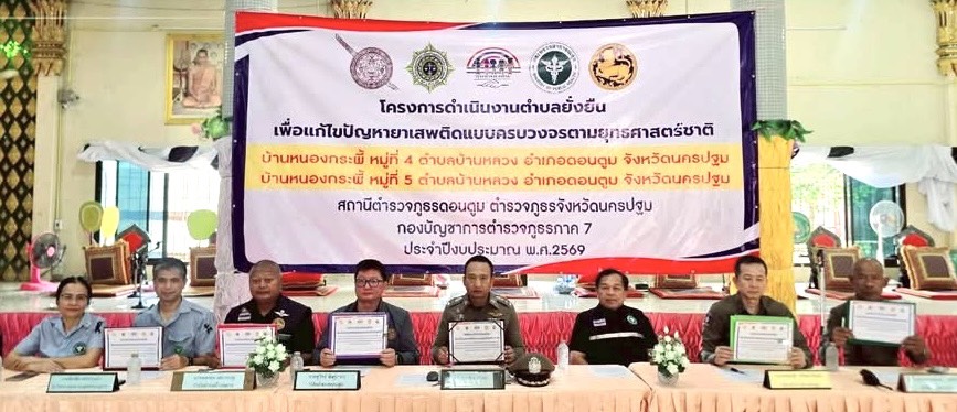 กิจกรรมในครั้งนี้มี พ.ต.ท.สมยศทรัพย์จรัสแสง รอง ผกก.ป.สภ.ดอนตูม ชุดปฏิบัติการตำบลยั่งยืน พร้อมด้วย นายสุวิทย์ อังศุภากร ปลัดอำเภอฝ่ายความมั่นคงอำเภอดอนตูม พร้อมด้วยหัวหน้าส่วนราชการ ได้เข้าร่วมกิจกรรมในครั้งนี้ ซึ่งมีวัตถุประสงค์เพื่อแก้ไขปัญหายาเสพติดแบบครบวงจรตามยุทธศาสตร์ชาติ ประจำปีงบประมาณ 2569 และมีการร่วมลงนาม MOU บันทึกข้อตกลงร่วมกันจากภาคีเครือข่ายของเจ้าหน้าที่ตำรวจ ร่วมกับ ผู้บริหารองค์กรปกครองส่วนท้องถิ่น กำนันตำบลบ้านหลวง ผู้ใหญ่บ้านฯ ผู้นำชุมชน จนท.สาธารณสุข อสม. และผู้มีส่วนเกี่ยวข้อง ณ ศาลาเอนกประสงค์ (วัดหนองกระพี๊) ต.บ้านหลวง อ.ดอนตูม จ.นครปฐม
