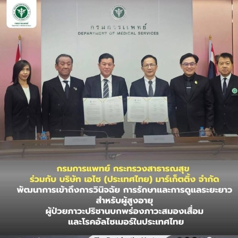 ณ ห้องประชุมแสงสิงแก้ว อาคาร 1 ชั้น 1 ตึกกรมการแพทย์ กระทรวงสาธารณสุข โดยมี นพ.ณัฐพงศ์ วงศ์วิวัฒน์ อธิบดีกรมการแพทย์ กระทรวงสาธารณสุข เป็นประธานในพิธี นางดรุณี โพธิ์ศรี รองนายแพทย์สาธารณสุขจังหวัดนครปฐม พร้อมด้วย นพ.ดนิษฐ์ เลียวสุธามาศ นายแพทย์ชำนาญการ เฉพาะทางสาขาประสาทวิทยา ผู้แทนผู้อำนวยการโรงพยาบาลนครปฐม นายวิโรจน์ ทองเกลี้ยง หัวหน้ากลุ่มงานส่งเสริมสุขภาพ สสจ.นครปฐม ร่วมเป็นเกียรติในพิธีลงนามบันทึกข้อตกลงความร่วมมือทางด้านการบริการสุขภาพและวิชาการ (MOU) พื้นที่ต้นแบบการดูแลภาวะสมองเสื่อม ระหว่างกรมการแพทย์ กับ บริษัทเอไซ (แห่งประเทศไทย) จำกัด เพื่อพัฒนาการเข้าถึงการวินิจฉัย การดูแลสำหรับผู้สูงอายุ ผู้มีภาวะโรคสมองเสื่อม