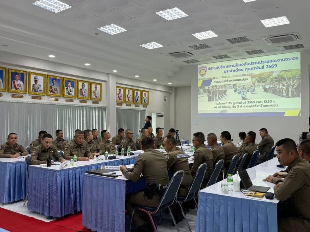 ณ ห้องประชุม ภ.จว.นครปฐม ชั้น 3 ต.ถนนขาด อ.เมืองนครปฐม จ.นครปฐม พล.ต.ต.พิทักษ์ อุปพงษ์ ผบก.ภ.จว.นครปฐม (ประธานการประชุม) พร้อมด้วยเจ้าหน้าที่ที่เกี่ยวข้อง ร่วมประชุมบริหารงานป้องกันปราบปรามอาชญากรรมและงานจราจร ประจำเดือน กุมภาพันธ์ 2569 ในการประชุมได้มีการติดตามผลการปฏิบัติงานด้านการป้องกันและปราบปรามอาชญากรรม การรักษาความสงบเรียบร้อย การป้องกัน เหตุอาชญากรรมในพื้นที่ รวมถึงการบริหารจัดการงานจราจร การอำนวยความสะดวกแก่ประชาชน และมาตรการลดอุบัติเหตุทางถนน เพื่อให้การปฏิบัติงานเป็นไปอย่างมีประสิทธิภาพ ทั้งนี้ ผู้บังคับบัญชาได้กำชับให้สถานีตำรวจในสังกัดจัดตั้งชุดปฏิบัติการ Six Man Team (Basic S.W.A.T.) เพื่อเข้าระงับเหตุในพื้นที่ โดยให้ถือปฏิบัติตาม S.O.P. และแผนเผชิญเหตุต่าง ๆ อย่างเคร่งครัด พร้อมเน้นย้ำให้มีความพร้อมทั้งด้านร่างกาย จิตใจ อาวุธประจำกาย อุปกรณ์ประจำรถ และทักษะความชำนาญในการฝึกยุทธวิธี เพื่อให้สามารถระงับเหตุได้อย่างทันท่วงทีและปลอดภัย นอกจากนี้ ได้กำชับการกวดขันจับกุมการพกพาอาวุธปืน ในเมือง ชุมชน หมู่บ้าน ทางสาธารณะตามนโยบายของรัฐบาลและข้อสั่งการของผบ.ตร. โดยในโอกาสนี้ได้ร่วมมอบข้าวสารให้แก่เจ้าหน้าที่ตำรวจที่เข้าร่วมประชุมเพื่อเป็นขวัญและกำลังใจในการปฏิบัติหน้าที่
