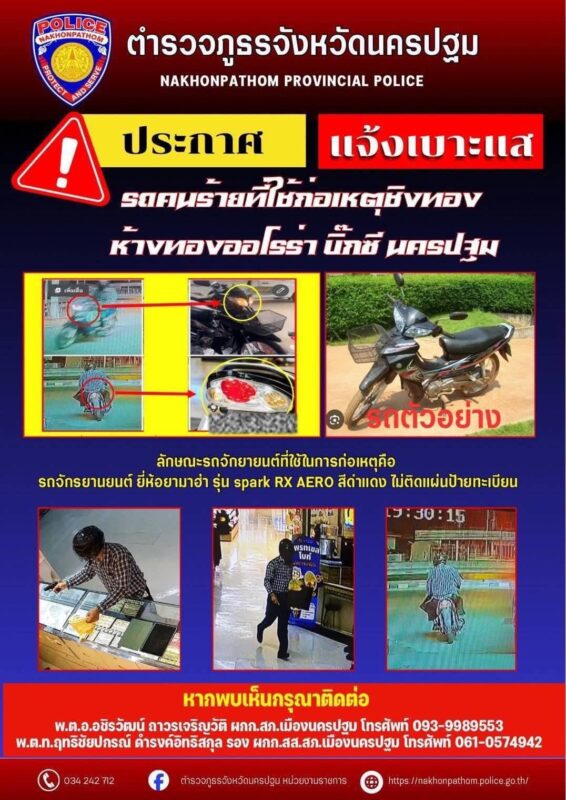 สืบเนื่องเมื่อวันที่ 11 มีนาคม 2569 เวลาประมาณ 19.27 น. ได้มีคนร้ายเป็นชาย จำนวน 1 คน ใช้อาวุธปืนก่อเหตุ ชิงทรัพย์ร้านทองภายในห้างดังนครปฐม โดยคนร้ายได้ สวมหมวกกันน็อกปิดบังใบหน้าและแต่งกายเพื่ออำพรางตัว ก่อนเข้าไปภายในห้างสรรพสินค้าแห่งหนึ่งนครปฐม จากนั้นได้ใช้อาวุธปืน ยิงข่มขู่พนักงานร้านทอง แล้วปีนเข้าไปทุบกระจกตู้แสดงสินค้า ก่อน นำเอาสร้อยคอทองคำ น้ำหนักเส้นละ 2 บาท จำนวน 23 เส้น น้ำหนักรวม 46 บาท มูลค่าประมาณ 3,680,000 บาท แล้วหลบหนีออกจากที่เกิดเหตุ