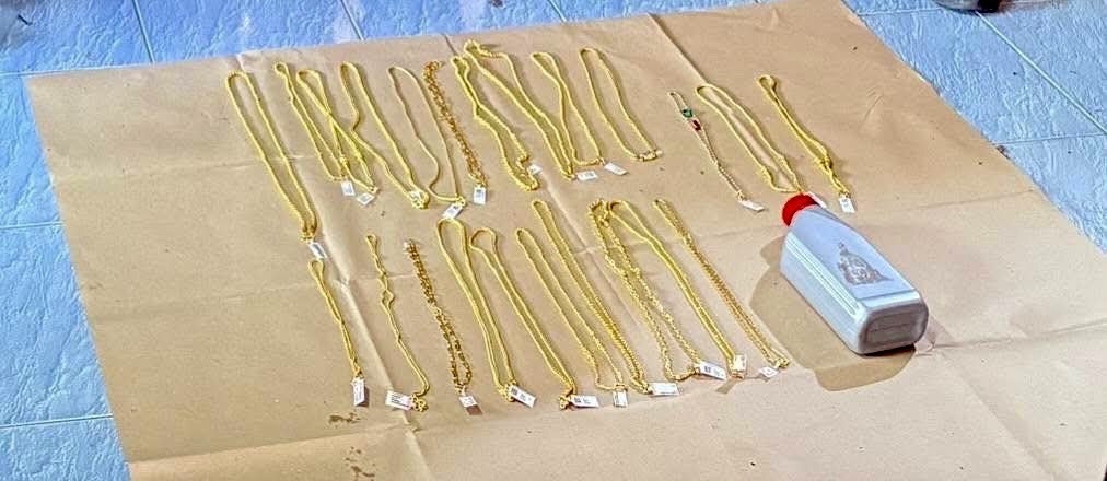 พร้อมของกลางในคดี อาวุธปืน แบลงค์กัน ยี่ห้อ โซรากิ ขนาด 9 มม. จำนวน 1 กระบอก พร้อมกล่องใส่อาวุธปืน หมวกกันน็อก แบบเต็มใบ สีน้ำเงิน จำนวน 1 ใบ รถจักรยานยนต์ ยี่ห้อ ยามาฮ่า รุ่น สปาร์ค สีดำ คันหมายเลขทะเบียน ขลน 428 ราชบุรี เสื้อผ้า-เครื่องแต่งกาย ที่ผู้ต้องหาใช้ในวันก่อเหตุ สร้อยคอทองคำรูปพรรณ น้ำหนัก 2 บาท จำนวน 23 เส้น มูลค่า 3,680,000 บาท โดยจับกุมตัวได้ที่บ้านพักต.หลักสาม อ.บ้านแพ้ว จ.สมุทรสาคร