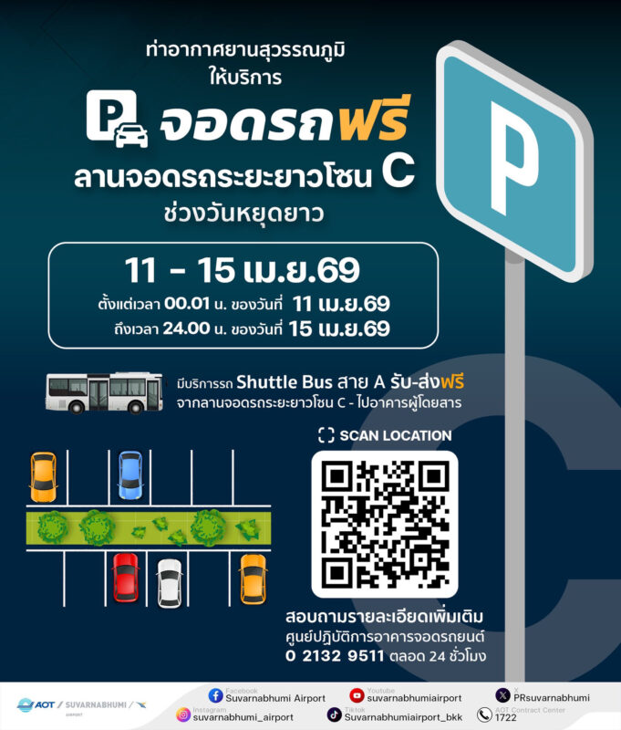 ทั้งนี้ เพื่อเป็นการช่วยบรรเทาภาระค่าใช้จ่ายของประชาชนในช่วงวันหยุดยาว ทสภ. ให้บริการจอดรถฟรี 5 วัน ตั้งแต่เวลา 00.01 ของวันเสาร์ที่ 11 เมษายน 2569 ถึงเวลา 24.00 น. ของวันพุธที่ 15 เมษายน 2569 ณ ลานจอดรถระยะยาวโซน C พร้อมจัดรถรับ – ส่ง ระหว่างลานจอดรถและอาคารผู้โดยสารทุก 15 นาที ตลอด 24 ชั่วโมง