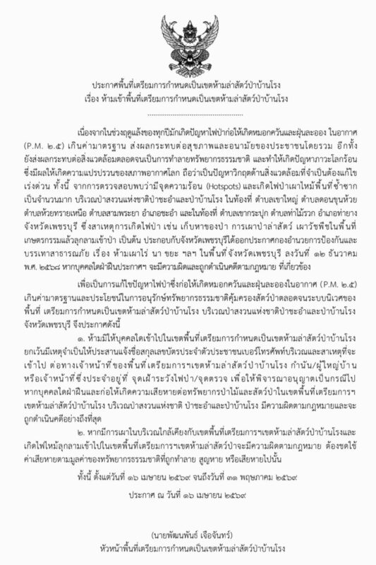 ด้านป่าสงวนแห่งชาติป่าชะอำ-ป่าบ้านโรง จังหวัดเพชรบุรี ได้เกิดไฟป่ามาตั่งแต่ 10-17เมษ.ที่ผ่สานมาส่งผลให้พื้นที่เสียหายไปกว่า 700ไร่ ล่าสุดนายพัฒนพันธ์ เจือจันทร์ หัวหน้าพื้นที่เตรียมการกำหนดเป็นเขตห้ามล่าสัตว์ป่าบ้านโรง ได้ออกหนังสื่อประกาศพื้นที่ป่าเตรียมการกำหนดเป็นเขตห้ามล่าสัตว์ป่าบ้านโรง บริเวณป่าสงวนแห่งชาติป่าชะอำ-ป่าบ้านโรง จังหวัดเพชรบุรี ห้ามมิให้บุคคลใดเข้าไปในเขตพื้นที่เตรียมการกำหนดเป็นเขตห้ามล่าสัตว์ป่าบ้านโรง ยกเว้นมีเหตุจำเป็นให้ประสานแจ้งชื่อสกุลเลขบัตร ปชช.เบอร์โทรศัพท์บริเวณ และสาเหตุที่จะเข้าไป ต่อเจ้าหน้าที่ของพื้นที่ฯ กำนัน ผู้ใหญ่บ้า หรือเจ้าหน้าที่ซึ่งประจำจุดเฝ้าระวังไฟป่า/จุดตรวจ เพื่อให้พิจารณาอนุญาตเป็นกรณีไป หากพบบุคคลใดฝ่าฝืนและก่อให้เกิดความเสียหายต่อทรัพยากรป่าไม้และสัตว์ป่าในเขตพื้นที่เตรียมการฯเขตห้ามล่าสัตว์ป่าบ้านโรง บริเวณป่าสงวนแห่งชาติ ป่าชะอำและป่าบ้านโรง มีความผิดตามกฎหมายจะถูกดำเนินคดีอย่างถึงที่สุด หากพบมีการเผาในบริเวณใกล้เคียงกับเขตพื้นที่เตรียมการฯเขตห้ามล่าสัตว์ป่าบ้านโรงและเกิดไฟไหม้ลุกลามเข้าไปในเขตพื้นที่เตรียมการฯเขตห้ามล่าสัตว์ป่าจะมีความผิดตามกฎหมาย ต้องชดใช้ค่าเสียหายตามมูลค่าของทรัพยากรธรรมชาติที่ถูกทำลาย สูญหาย หรือเสียหายไปนั้น ตั้งแต่วันที่ 16 เมษายน 2569 จนถึงวันที่ 31 พฤษภาคม 2569 เป็นต้นไป
