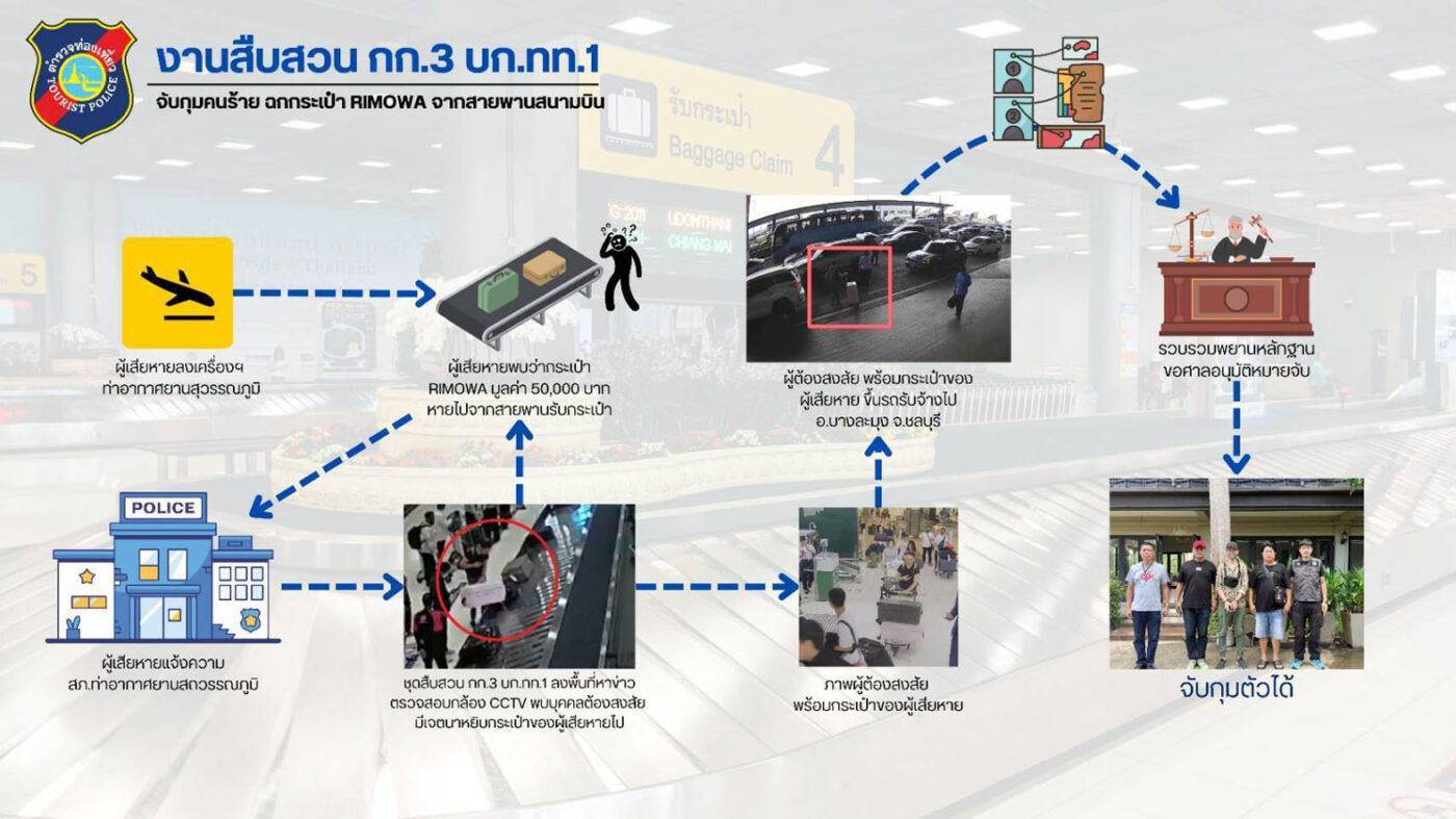 ต่อมาในวันที่ 29 เมษายน ศาลจังหวัดสมุทรปราการได้อนุมัติหมายจับเลขที่ 366/2569 เจ้าหน้าที่จึงสืบสวนขยายผลจนทราบว่าผู้ต้องหารายนี้หลบหนีไปพักอยู่ที่โรงแรมแห่งหนึ่งในพื้นที่พัทยา จ.ชลบุรี จึงนำกำลังเข้าจับกุมตัวไว้ได้พร้อมแจ้งข้อหา “ลักทรัพย์ในท่าอากาศยาน” ก่อนควบคุมตัวส่งพนักงานสอบสวน สภ.ท่าอากาศยานสุวรรณภูมิ เพื่อดำเนินคดีตามกฎหมาย