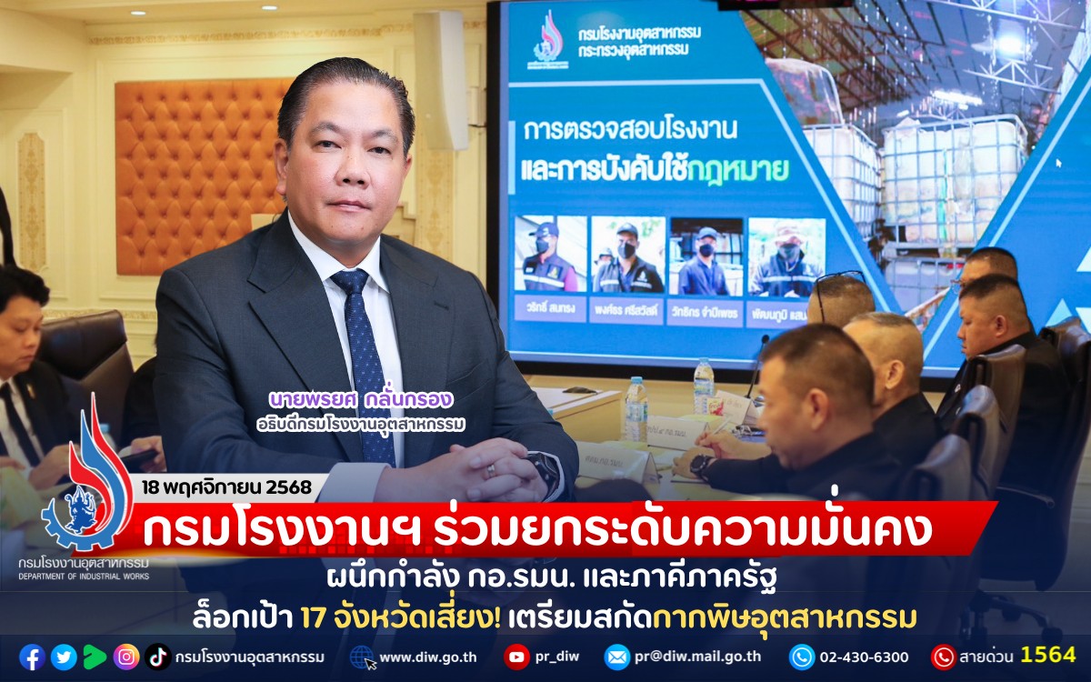 วันที่ 18 พฤศจิกายน 2568 เวลา 10.00 น. นายพรยศ กลั่นกรอง อธิบดีกรมโรงงานอุตสาหกรรม มอบหมายให้เจ้าหน้าที่กองบริหารจัดการกากอุตสาหกรรม เข้าร่วมประชุมกำหนดกรอบความร่วมมือ การบูรณาการกลไกความมั่นคงด้านสิ่งแวดล้อมเพื่อแก้ไขปัญหา กากสารพิษอุตสาหกรรม ครั้งที่ 1/2569 โดยมี พล.ท. วุทธยา จันทมาศ ผู้อำนวยการสำนักบูรณาการและขับเคลื่อนการปฏิบัติงาน กองอำนวยการรักษาความมั่นคงภายในราชอาณาจักร (สบข.กอ.รมน.) เป็นประธานการประชุม ร่วมด้วย เจ้าหน้าที่จากหน่วยงานที่เกี่ยวข้อง ประกอบด้วย กองอำนวยการรักษาความมั่นคงภายในราชอาณาจักร (กอ.รมน.) กรมควบคุมมลพิษ กองบังคับการปราบปรามการกระทำความผิดเกี่ยวกับทรัพยากรธรรมชาติและสิ่งแวดล้อม (บก.ปทส.) กรมสอบสวนคดีพิเศษ (DSI) กรมบังคับคดี กรมศุลกากร กระทรวงมหาดไทย สำนักงานตำรวจแห่งชาติ กรมทรัพยากรน้ำบาดาล สำนักงานป้องกันและปราบปรามการฟอกเงิน (สำนักงาน ปปง.) และกรมวิทยาศาสตร์ทหารบก เข้าร่วมประชุม ณ ห้องประชุม ชั้น 1 อาคารเพชรรัตน์ สบข.กอ.รมน. การประชุมในครั้งนี้ ทุกหน่วยงานราชการได้นำเสนอข้อมูลเพื่อกำหนดกรอบความร่วมมือ โดย กรมโรงงานอุตสาหกรรม นำเสนอประเด็นเกี่ยวกับอำนาจหน้าที่ตามกฎหมาย […]