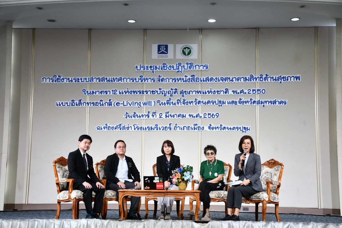 วันที่ 2 มีนาคม 2569 เวลา 09.00 น. สำนักงานสุขภาพแห่งชาติ (สช.) จัดการประชุม การจัดทำหนังสือแสดงเจตนาตามสิทธิ ด้านสุขภาพแบบอิเล็กทรอนิกส์ (e-Living will ) โดยเชิญ นพ.สุรชัย โชคครรชิตไชย ผู้อำนวยการโรงพยาบาลนครปฐม เข้าร่วมบรรยายและเสวนาในประเด็น “รู้สิทธิ์ คืนศักดิ์ศรี เลือกวาระสุดท้ายด้วยตนเอง” ณ ห้องประชุมศรีสง่า โรงแรมริเวอร์ จังหวัดนครปฐม สมคิด พรมมี ผู้สื่อข่าว นครปฐม