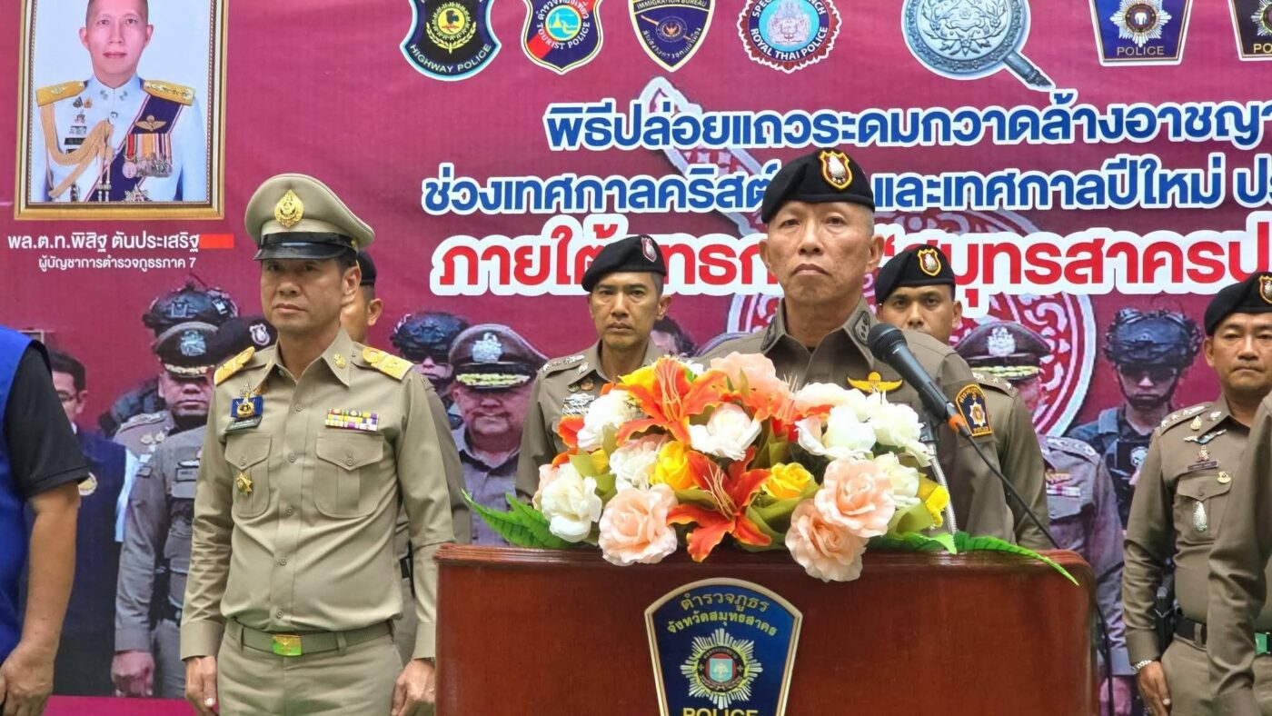 วันที่ 17 ธันวาคม 2568 เวลา 16.00 น. ที่ลานรวมพลตำรวจภูธรจังหวัดสมุทรสาคร พล.ต.ท.พิสิฐ ตันประเสริฐ ผู้บัญชาการตำรวจภูธรภาค 7 และ นายอำนาจ เจริญศรี ผู้ว่าราชการจังหวัดสมุทรสาคร ให้เกียรติเป็นประธานในพิธีปล่อยแถวระดมกวาดล้างอาชญากรรม เนื่องในเทศกาลคริสต์มาสและเทศกาลปีใหม่ 2569 โดยมี พล.ต.ต.ธีระเดช อธิภัคกุล ผบก.ภ.จว.สมุทรสาคร,พ.อ.พีรภาส บัวเจริญ รองผู้อำนวยการรักษาความมั่นคงภายในจังหวัดสมุทรสาคร,พ.ต.อ.อดุลย์ชัย เผ่าพันธุ์ศร รองผบก.ภ.จว.สมุทรสาคร , พ.ต.อ.พิเชษฐ์พงษ์ แจ้งค้ายคม รอง ผบก.ภ.จว.สมุทรสาคร,ผกก., ร.ต.ประพันธุ์ ถึกสกุล นอภ.เมืองสมุทรสาคร, รอง ผกก., กำลังพลจากข้าราชการตำรวจทุกสถานี ตำรวจในสังกัดตำรวจภูธรจังหวัดสมุทรสาคร และหน่วยปฏิบัติในพื้นที่ ได้แก่ ตำรวจท่องเที่ยว ตำรวจตรวจคนเข้าเมือง ตำรวจสันติบาล ตำรวจทางหลวง ตำรวจพิสูจน์หลักฐาน ฝ่ายปกครองจังหวัด ฝ่ายปกครองอำเภอ ทหาร กอ.รมน.สมุทรสาคร องค์กรปกครองส่วนท้องถิ่น และ มูลนิธิการกุศลสมุทรสาคร ร่วมบูรณาการความร่วมมือปฏิบัติการระดมกำลังกวาดล้างอาชญากรรมในพื้นที่จังหวัดสมุทรสาคร พล.ต.ท.พิสิฐ […]